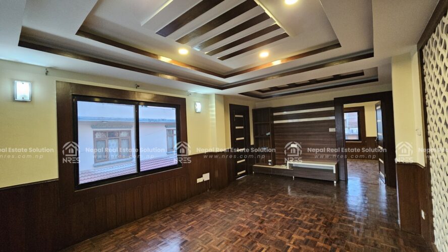 The 4BHK apartment for rent in Kathmandu. It features 4 bedrooms, 5 bathrooms, 2 living rooms, 1 dining area, and a dedicated pooja room. The property includes parking space for one car along with additional room for several bikes. It is semi-furnished and has convenient 13-ft road access.