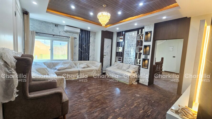 The house for sale in Lalitpur. It covers the area of 9 Aana and 1 paisa with the price of 9 crores and 50 lakh. It consists of 5 bedroom, 7 bathroom (4 attached), 2 kitchen, 3 living room, 1 pooja room. The house faces west direction with the road access of 20 feet.