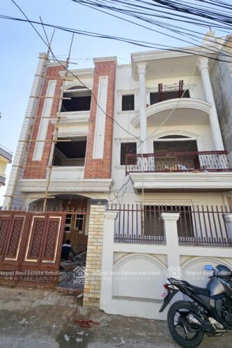 The house for sale in Lalitpur. It covers the area os 4 Aana with the price of 4.90 crores. It consists of 5 bedroom, 5 bathroom, 2 kitchen, 2 living, 1 pooja room, 1 laundry. The house is in north facing direction. It has the road access of 13 feet with the parking space for 1 car and few bikes.