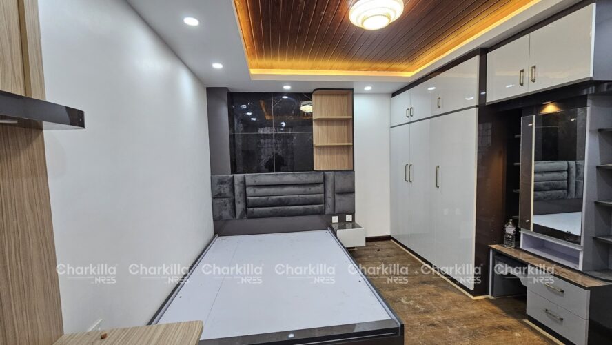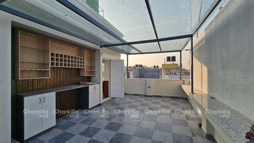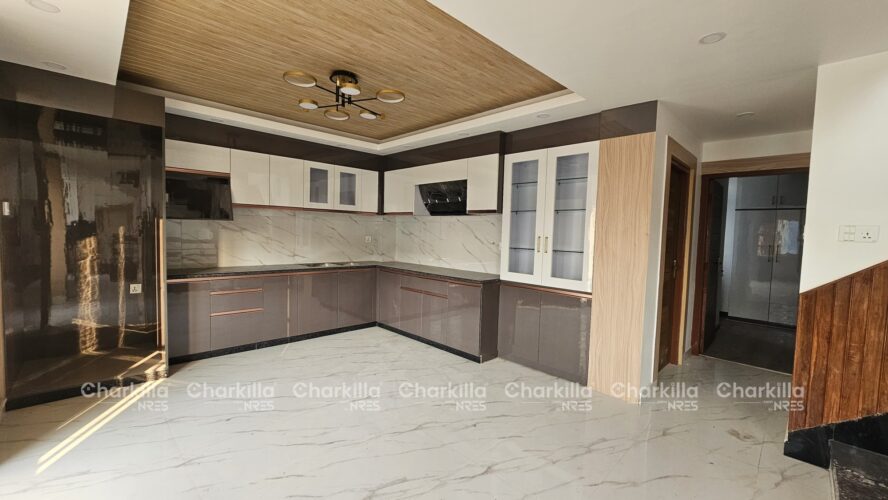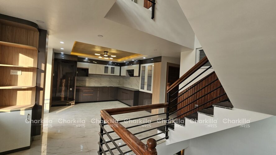 The house for sale in Lalitpur. It covers the land area of 3 aana with the price of Rs 2.95 crores. It consists of 5 bedroom, 5 bathroom(2 attached), 2 kitchen, 2 living room, 1 pooja room. The house has parking space for 1 car and few bikes parking with the road access of 13 feet. The house is west facing and is located at Imadol, Lalitpur.