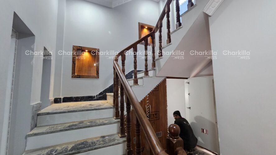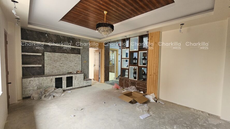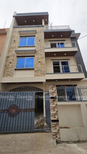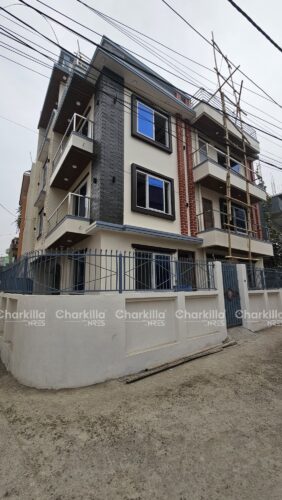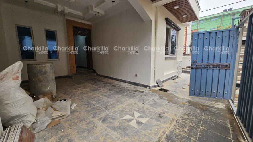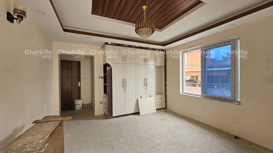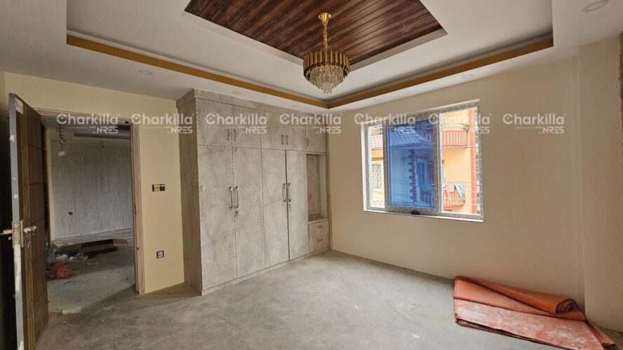 The house for sale in Lalitpur. It covers the land area of 4 aana with the price of Rs. 3.85 crores. It consists of 5 bedroom, 6 bathroom(3 attached), 2 kitchen, 2 living room, 1 pooja room. It has the parking space for 1 car and few bikes with the road access of 13 feet. The house was built in 2082 B.S.