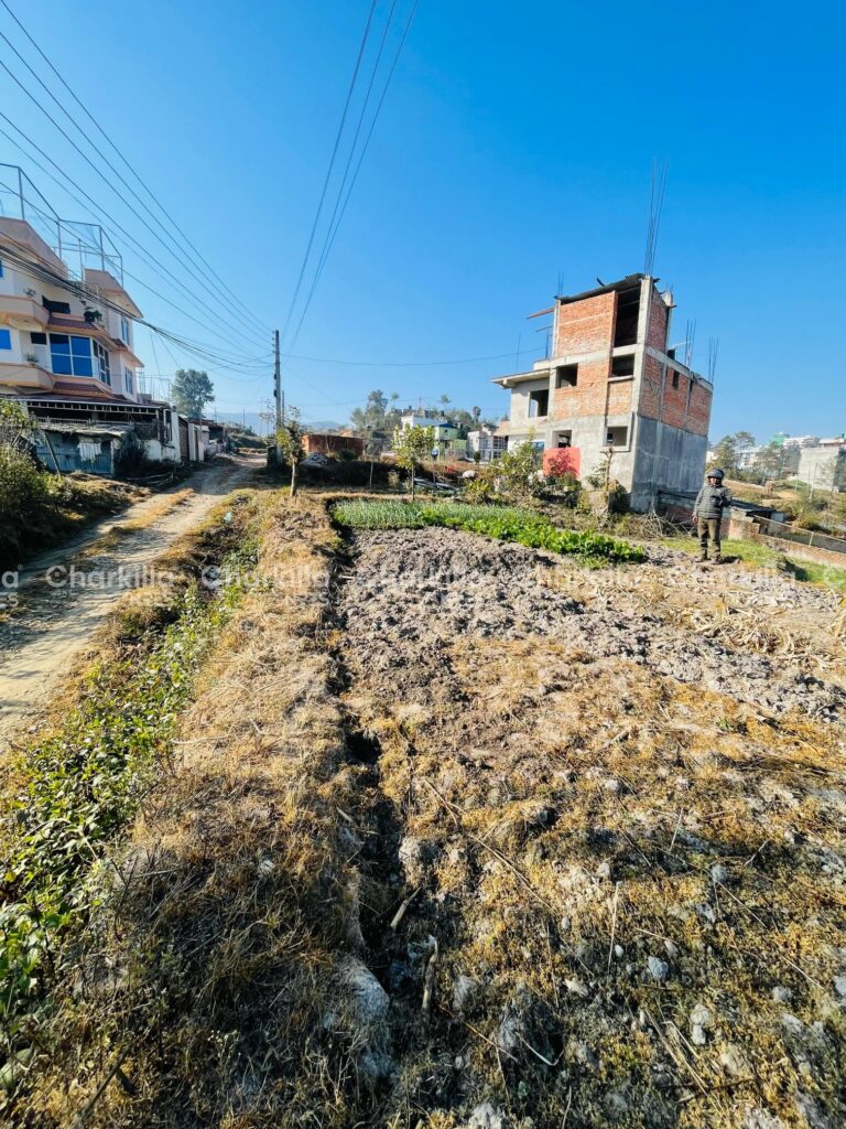 The land for sale in Lalitpur. It has the area of 4 aana 1 paisa with the price of Rs 20 lakh per aana. It has the road access of 16 feet on east side, 14 feet on north side, 10 feet on south road. It is located at Bajrabarahi, Lalitpur.